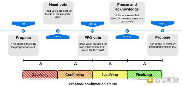 如今,以太坊的Gasper共识采用slot和epoch架构。每隔 12 秒 slot,验证者子集会在链区块头上发布投票,在 32 个 slot(6.4 分钟)内,所有验证者都有机会投票一次。然后,这些投票被重新解释为类似于PBFT 的共识算法中的消息,该算法在两个 epoch(12.8 分钟)后提供非常严格的经济保证,称为最终确定性。