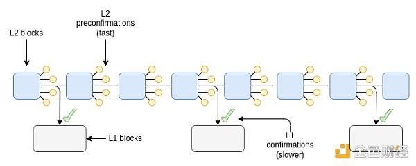 到目前为止,至少在口头上,L2 有责任创建自己的“去中心化排序”网络。一小部分验证者会签署区块,可能每隔几百毫秒一次,他们会将自己的“质押”放在这些区块后面。最终,这些 L2 区块的区块头会发布到 L1。