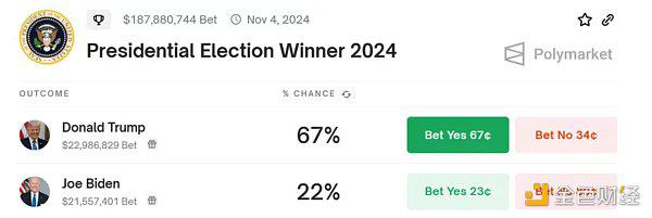 一份要求赌徒预测 2024 年大选结果的合约目前已下注近 1.88 亿美元,其中约 2300 万美元押注特朗普,2100 万美元押注拜登。Polymarket 上的赌注被放置在 Polygon 区块链上的智能合约中,并以 USDC 稳定币结算。