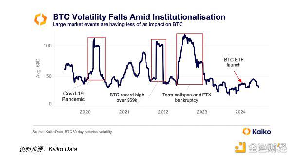 Kaiko 的另一份报告称,通过比特币 ETF 对加密货币的机构采用也导致价格波动性大幅降低。