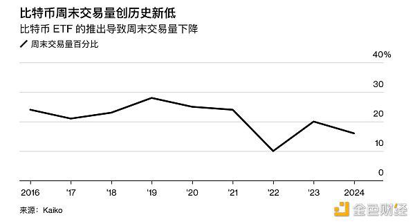 加密货币研究公司 Kaiko 的数据显示,今年周末交易的比特币比例已降至 16% 的历史最低水平。