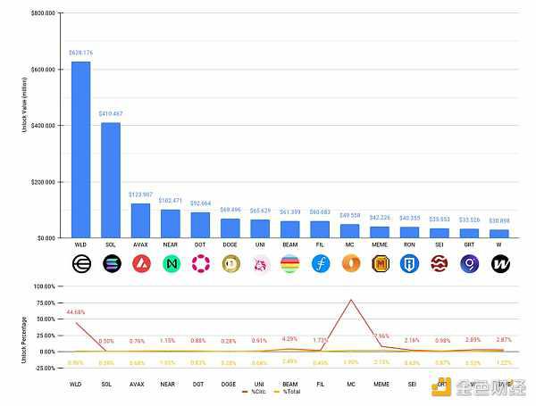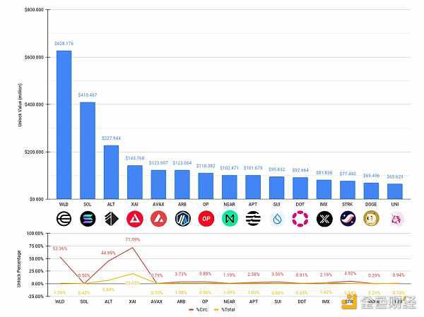 $WLD 本月解锁金额最高,超过 6 亿美元,解锁规模占当前流通供应量的 53.36%。