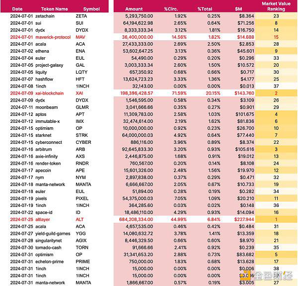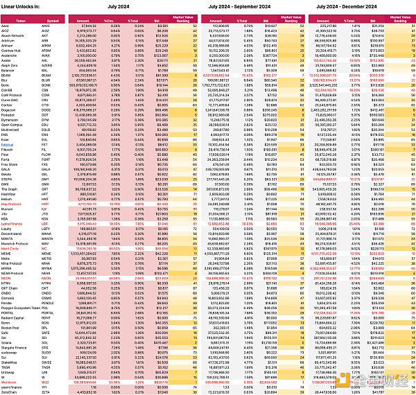 下表列出了计划于 2024 年 7 月进行的线性和新发行解锁代币,按每个代币的符号字母顺序排序。