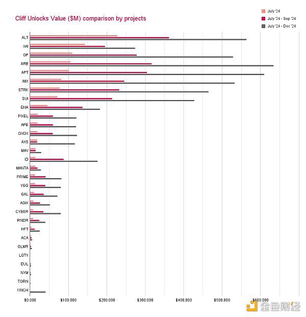 在本月、本季度以及下个季度,按 2024 年 7 月的解锁价值排序,长期投资者应关注悬崖解锁价值较高的代币。