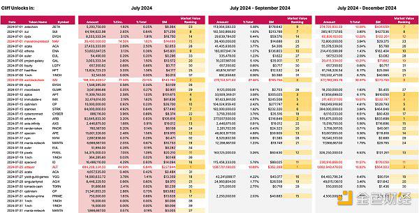 本月、本季度以及下个季度,按 2024 年 7 月的解锁价值排序。长期投资者应关注具有高悬崖解锁价值的代币。
