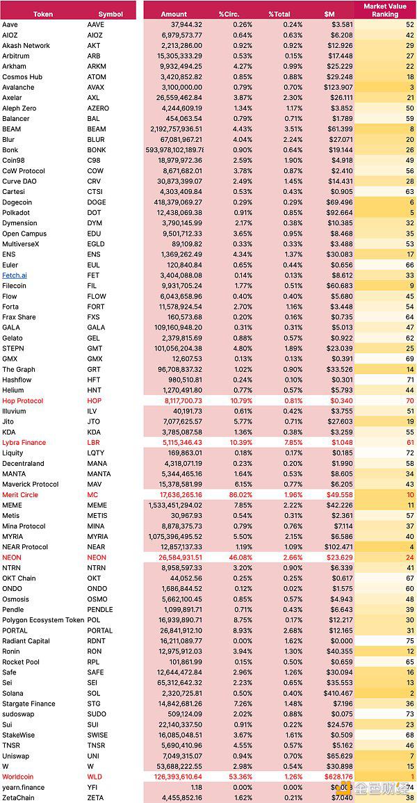 在比较解锁价值时,市值较高的项目比市值较小的项目影响更大。如上图所示,前 10 个项目中的大多数市值都相对较高。