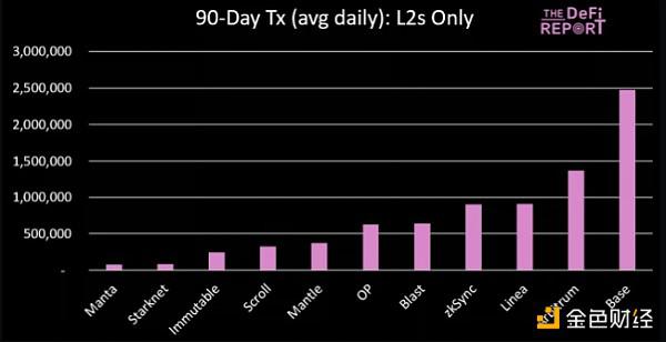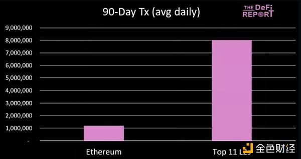 平均而言,与以太坊 L1 相比,顶级 L2 现在每天处理的交易数量是以太坊 L1 的 6.7 倍。