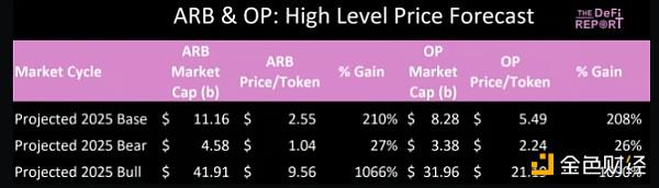 代币解锁是真实的。它们显然会影响预测回报。例如,Arbitrum 的基本案例预计明年市值将增长 315%,但每个代币的价格仅增长 210%。正是由于这个原因,ETH 在基础场景和熊市场景中表现优于 L2。