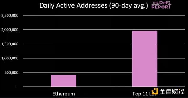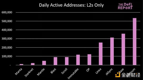 目前,顶级 L2 的每日活跃地址数量是以太坊的 4.7 倍。以下是 L2 的排行榜: