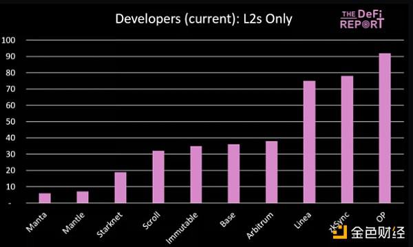 在这里,Optimism 首次出现在第一名的位置,今天 Arbitrum 上的活跃开发者数量是其两倍多。值得注意的是,Base 处于中间位置——这表明考虑到应用程序、用户和链上费用,他们从开发人员那里获得的收益比竞争对手更多。