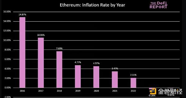 作为参考,以太坊在 2023 年处于通缩状态 (-.28%),并且在 2024 年迄今为止一直处于通缩状态 (-.02%)。以下是以太坊自成立以来的通货膨胀率: