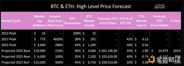 *上述预测假设 ETH 的流通代币供应量保持不变。 BTC 的供应量是已知的。因此,使用实际值并加上一年的通货膨胀。此外,“BTC 主导地位”和“ETH 占 BTC MC 的百分比”取自周期峰值。