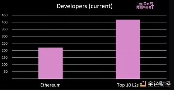 目前,顶级 L2 的活跃核心开发人员数量大约是目前的两倍。 *Token Terminal 将核心开发人员定义为在过去 30 天内向项目的公共存储库做出 1+ 次提交的不同 Github 用户的数量。这些数字不包括生态系统/应用程序开发人员。