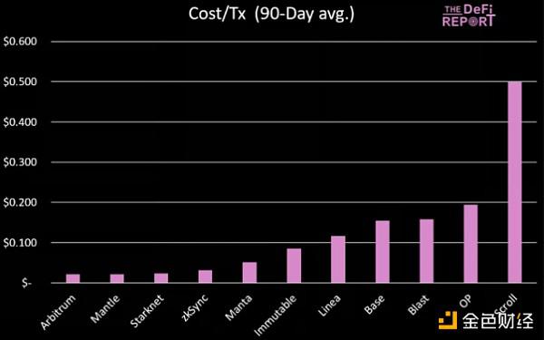 平均成本/交易揭示了为什么 Arbitrum 尽管在交易方面排名第二,但其费用却处于中间位置:在 Arbitrum 上的交易成本为 0.02 美元,而在 Base 上的交易成本为 0.15 美元。作为参考,同期以太坊的平均交易费用为 5.30 美元。