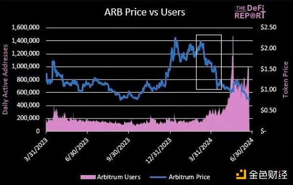 我们可以在下图中看到代币解锁的影响。例如,Arbitrum 的解锁从三月份开始,我们可以在下面看到对价格的影响。这抵消了 Arbitrum 基本面的惊人增长(粉色代表活跃用户增长)。