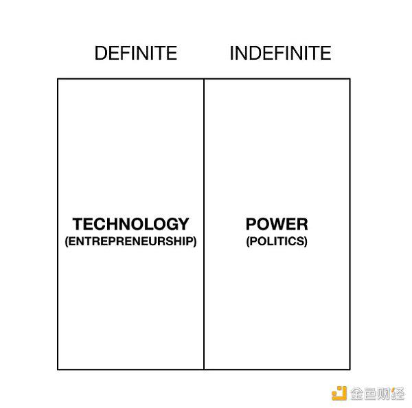我将政治与科技框架为确定和不确定之间的垂直分界线。这是因为政治不是关于创造财富,而是关于治理和分配。最好的情况下,良好的政治是科技和创业的促进者。但它本身并不创造未来。科技做到了。它是社会展开的基质,是人类之间信息交流的网络。