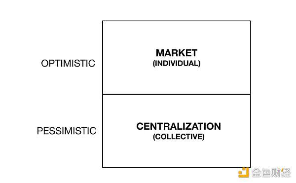 横向分界线是关于个人角色与集体角色的。乐观主义者强调上述个人,个人成为基础。这更多的是关于从下往上的变化和通过去中心化实现的鲁棒性。而悲观主义者看到世界是脆弱的,想依赖自上而下的控制。他们认为只有通过权力才能修复事物,以防止事情变得更糟。