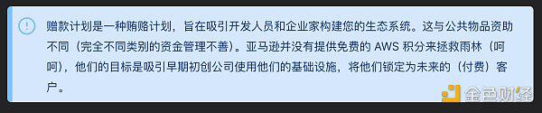 为了评估执行良好的生态系统支持计划的潜在影响,我们可以参考 Web2 巨头亚马逊的 AWS Activate 计划。该计划向超过 28 万家初创公司提供了超过 60 亿美元的信用额度,其中包括如今家喻户晓的爱彼迎、奈飞和优步等公司。这不仅提升了亚马逊的声誉,还确保了忠诚的客户群。