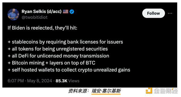 区块链分析公司 Messari 创始人兼首席执行官 Ryan Selkis 声称:投票给拜登就是投票反对美国加密货币行业,如果拜登连任,加密行业将面临一系列敌对监管。