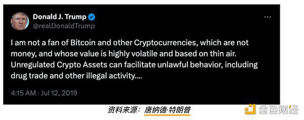 在他的总统任期内,特朗普普遍对加密货币持批评态度。他提出了许多来自政治家的常见批评,主要认为加密货币是“没有基础”的,并被用于毒品和其他非法活动。