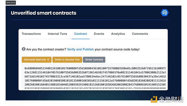 访问您选择的链的区块浏览器,并查看源代码是否经过验证。例如在以太坊的区块浏览器Etherscan上,看起来像下图这样。下图中的代码没有经过验证,应该是一个明显的警告信号。如果代码没有经过验证,您可能遇到了骗局。