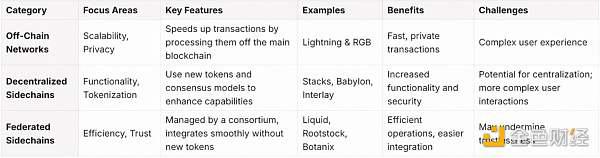 - 联合侧链:通过可信的财团简化操作,提供效率,但可能以牺牲比特币的基础去中心化为代价。例如Liquid,Rootstock,Botanix。