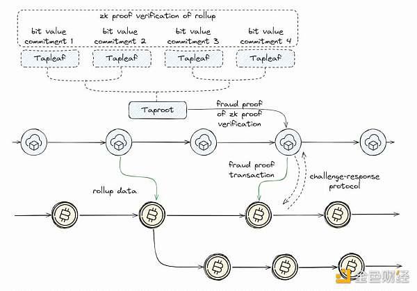 - Optimistic rollups:BitVM采用乐观rollup技术,通过批量处理多个链外交易来显著提高比特币的可扩展性。这些交易在链外处理,定期将其结果记录在比特币账本上以确保完整性和可用性。在实际操作中,BitVM在链外处理这些交易,并间歇性地在比特币账本上记录其结果,以确保完整性和可用性。BitVM中使用的乐观rollups代表了一种克服比特币固有可扩展性限制的方法,利用链外计算能力,同时确保通过周期性链上验证维护交易有效性。这种系统有效地平衡了链上和链外资源的负载,优化了交易处理的安全性和效率。