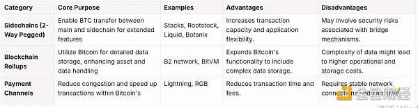 从另一个技术角度看,我们根据主要技术特征对比特币的Layer 2解决方案进行分类。这种不同的分类方法考察了各种技术细节和结构,提供了对每个解决方案如何贡献于增强比特币的可扩展性、安全性和功能的细致理解。每种方法都有其独特的目的,这些目的并不冲突,也不会制造三难困境。然而,每种方法在安全性和可扩展性方面都有各自的优劣。因此,一些系统可能会结合这些方法。我们将在文章的下一部分详细讨论这一点。让我们探讨这些类别: