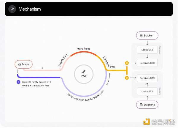 - 在PoX中,矿工将BTC转移到Stack网络参与,而不是像在烧毁证明(Proof of Burn)中那样烧毁比特币。这样不仅通过BTC奖励激励参与,还直接将Stacks的操作稳定性与比特币的验证安全属性联系起来。Stacks交易锚定在比特币区块,每个Stacks区块使用OP_RETURN操作码在比特币交易中记录一个哈希值,该操作码允许嵌入多达40字节的任意数据。这个机制确保了任何对Stacks区块链的更改都需要相应更改比特币区块链,从而在不改变其协议的情况下受益于比特币的安全性。