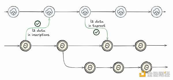 铭文在比特币的Layer 2生态系统中引发了创新浪潮。随着两个突破性更新(Segwit和Taproot)的推出,Ordinals协议被引入,使任何人都能将额外数据附加到UTXO的Taproot脚本中,最大可达4MB。这个发展使社区意识到比特币现在可以作为数据可用性层。从安全角度看,铭文提供了一种新的视角。数据,如数字文物,现在直接存储在比特币网络上,使其不可更改,并保护它们不受外部服务器问题的篡改或丢失。这不仅增强了数字资产的安全性,还将它们直接嵌入比特币的区块中,确保其永久性和可靠性。最重要的是,比特币rollups成为现实,铭文提供了一种在交易中加入额外数据或功能的机制。这允许在主链之外进行更复杂的交互或状态变化,同时仍然依赖于主链的安全模型。