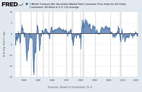 在过去的一个世纪里,国债和银行现金只是跟上了通货膨胀的步伐,没有提供任何实际回报。然而,这往往非常不稳定。在 20 世纪 40 年代、70 年代和 2010 年代等几十年里,国债和银行现金的持有者一直未能跟上通货膨胀的步伐。这张图表显示了九十年来的国债利率减去官方通胀率: