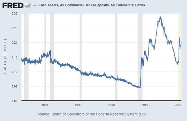 如图所示,在全球金融危机爆发之前,这一比例曾低于 5%(这也是此次危机如此严重并标志着长期债务周期的转折点的原因),但随着量化宽松、新法规和更多自我监管的实施,银行现在拥有约 20% 的存款余额作为储备。