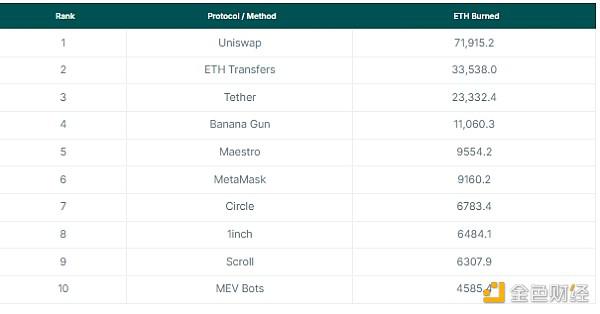 第四大销毁者是 Banana Gun (BANANA),销毁了 11,060 ETH。Telegram 交易机器人在第二季度销毁了 2,150 ETH,较第一季度(8,364 ETH)下降 74.3%。它支持的区块链上的 DEX 交易下滑影响了其销毁率。排名前 10 的其余协议各自销毁的 ETH 不到 10,000。